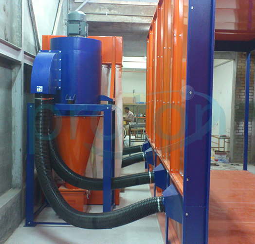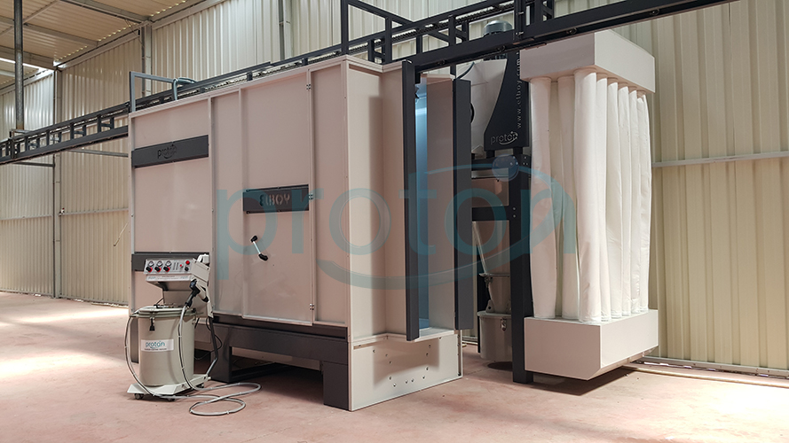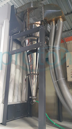 The cyclone consists of two separate units. Powder paint particles thrown in the cabin are absorbed by the cyclone. The dust absorbed is collected in the storage under the cyclone. The powder paint accumulated here is then transferred to the tank of the powder coating gun and reused. This transfer can be done manually or automatically if requested.
