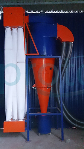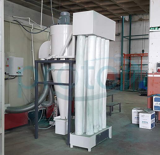 The specially designed construction that separates the air and electrostatic powder paint from each other with the help of centrifuge movement is called cyclone. When the mixture of air and powder paint coming into the cyclone with a certain air flow rate enters this special construction, it slows down due to the enlargement of the section and performs the vortex movement.