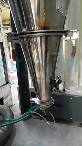 Thanks to this movement, when the mixture of air and powder paint undergoes multiple changes from rapid movement to a larger volume, the powder falls down due to gravity and the air passes to the filter section.