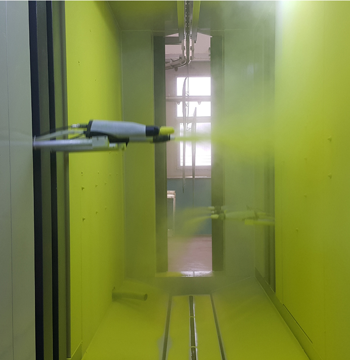The curtain system, which provides a seal between the cascade and the paint passage, minimizes the risk of malfunction by preventing the cascade from coming into contact with the paint.