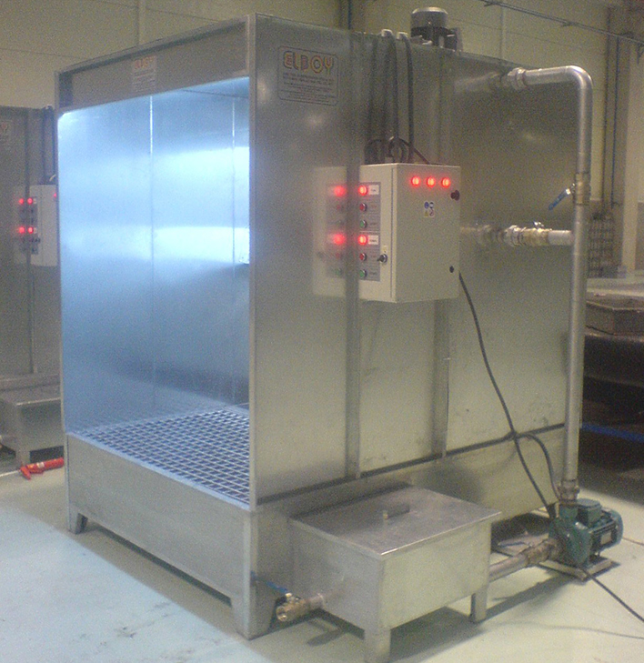 Wet paint particles vacuumed through suction fan in the air are caught by the water curtain on the back of the booth and sent to the pool.
