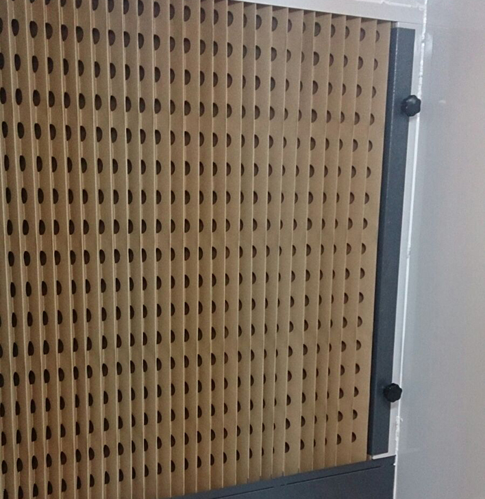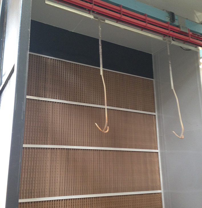 Wet paint particles vacuumed through suction fan in the air are caught by the accordion filter on the back of the booth.