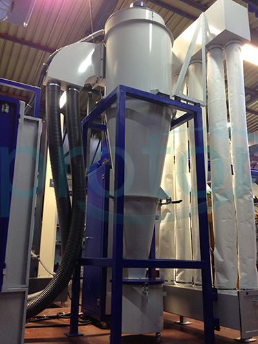 The cyclone consists of two separate units. Powder paint particles thrown in the cabin are absorbed by the cyclone. The dust absorbed is collected in the storage under the cyclone. The powder paint accumulated here is then transferred to the tank of the powder coating gun and reused. This transfer can be done manually or automatically if requested.