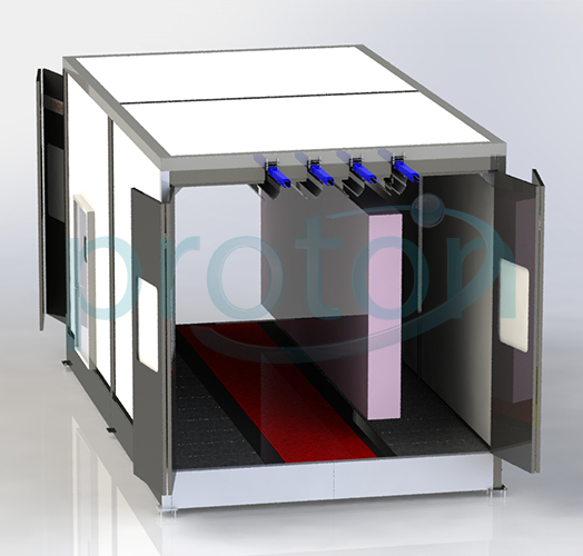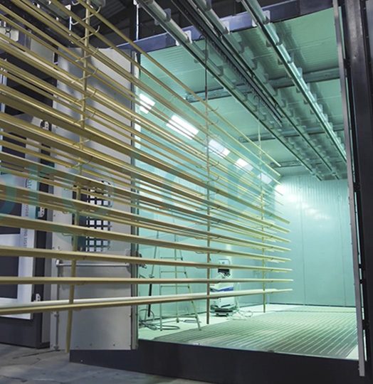 It works on the principle of manual painting of products suspended on a rail or placed on a trolley.It is integrated into manual painting systems. Suitable for bar transfer systems.Product entry options are available with top hanging or bottom trolley.