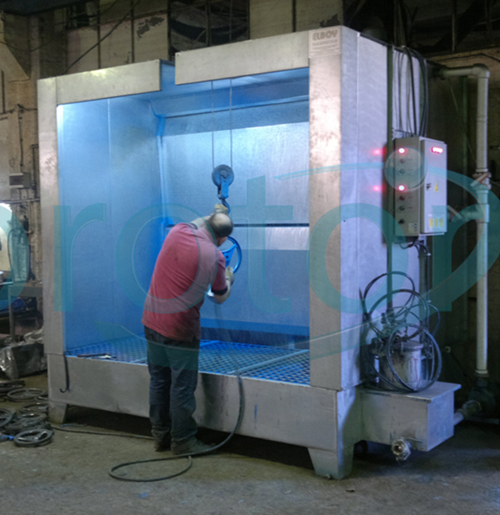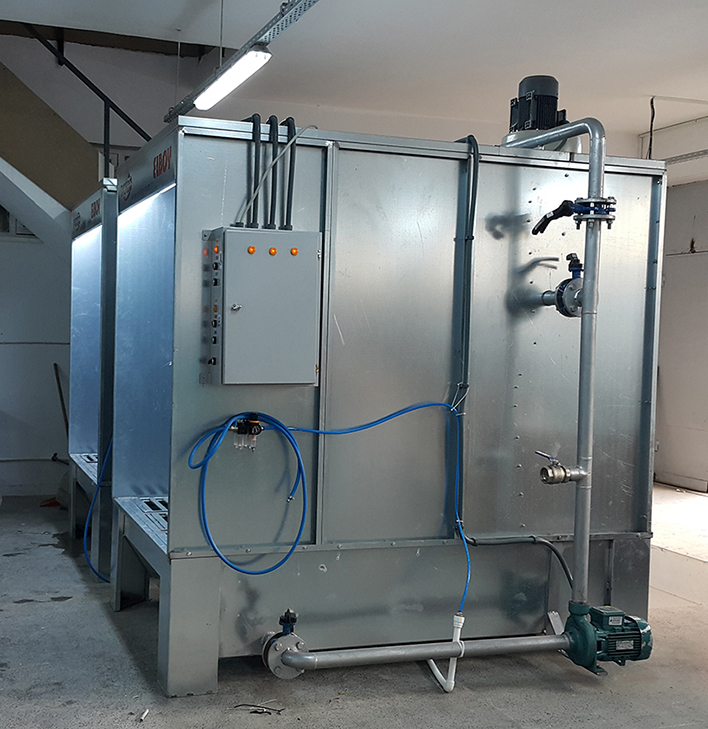 While painted dirty water accumulated in the pool passes to the pumping suction chamber, it passes through a coarse grid and a fine grid in order to prevent blockage of the pump spraying water, thus ensuring paint particles to be retained.