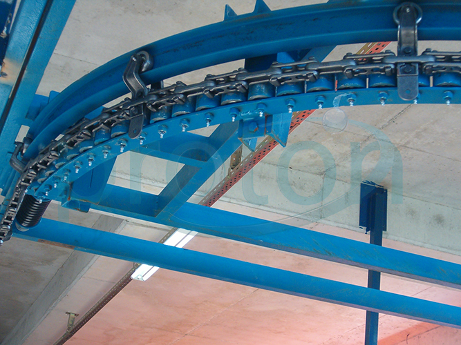 - Operating principle of this type of conveyors is based on transferring suspended materials by chains and trolleys moving on a NPI profile by the help of a drive unit.
